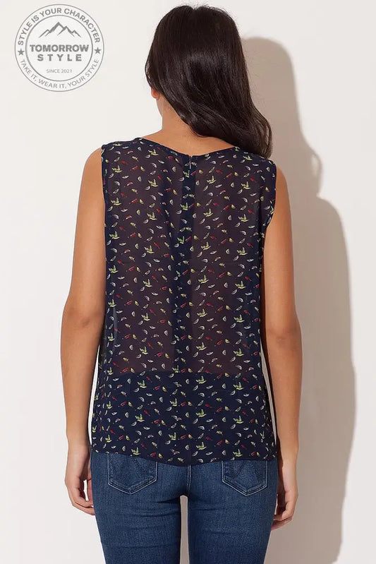 • Leichte Chiffonbluse mit Vögeln und ärmellosem Schnitt