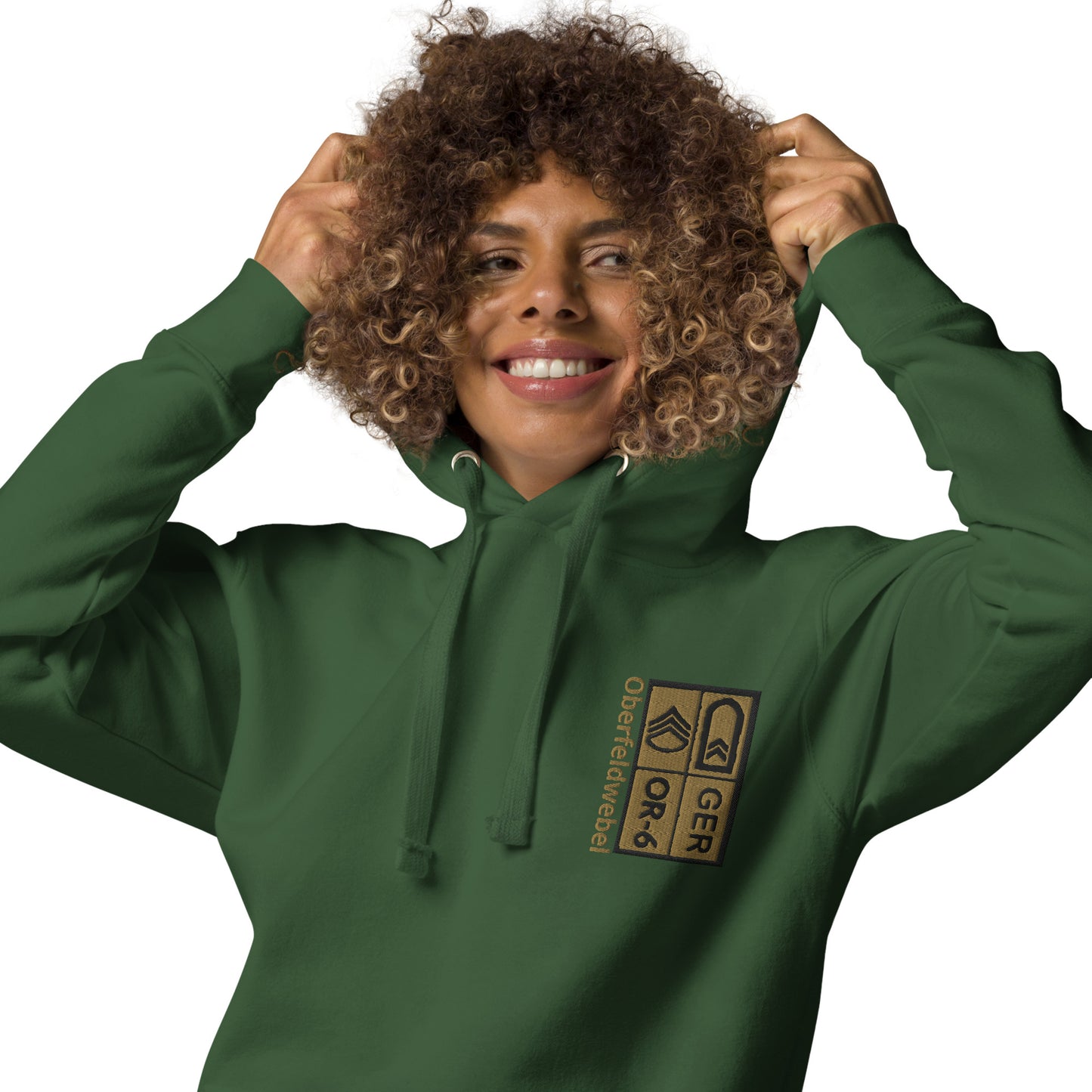 Bestickter Bundeswehrdienstgrad (OF) Hoodie mit bedrucktem Pionierabzeichen für Damen und Herren.